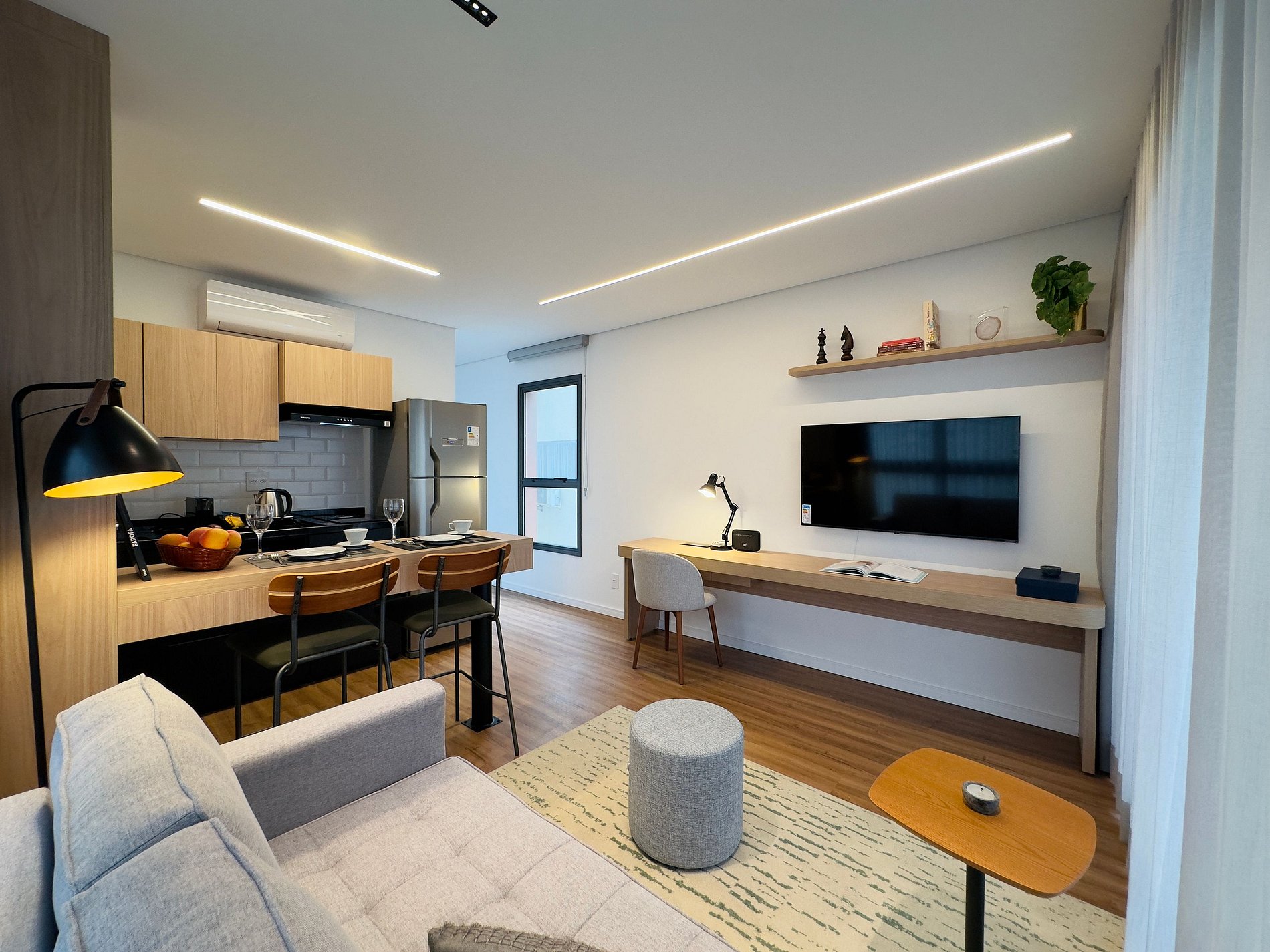 Com layout moderno e ambientes bem distribuídos, oferece sala aconchegante integrada à cozinha, varanda ampla com vista urbana e quarto confortável. Decoração contemporânea, tons suaves e iluminação natural criam uma atmosfera acolhedora. Ideal para quem busca conforto, privacidade e praticidade em uma das melhores áreas de São Paulo.
