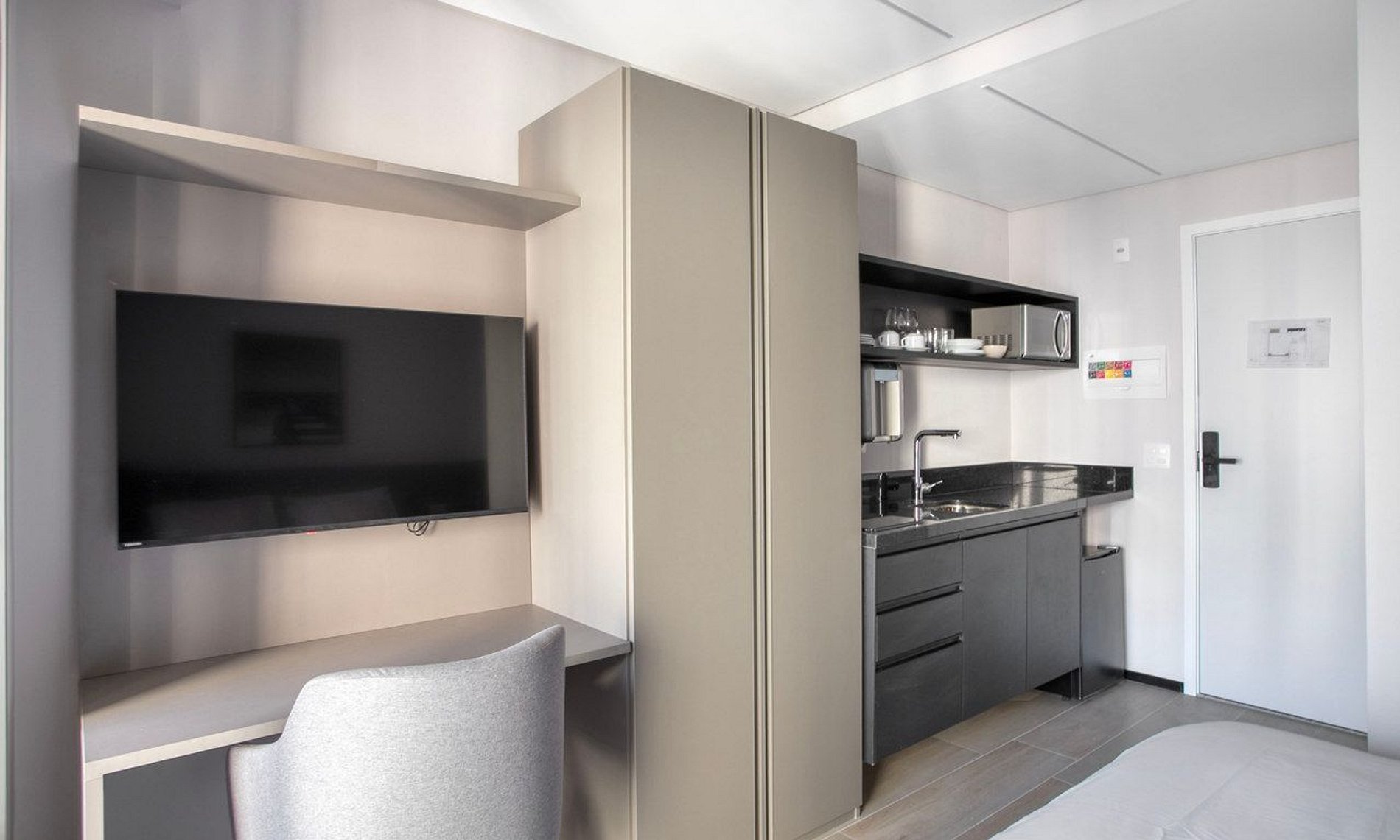 Relaxe na piscina do rooftop com vista para a cidade, mantenha sua rotina na academia equipada, trabalhe com foco no coworking com Wi-Fi de alta velocidade e aproveite as comodidades do dia a dia, como lavanderia, cozinha compartilhada, bicicletário, armário para entregas e até um mercadinho no térreo.